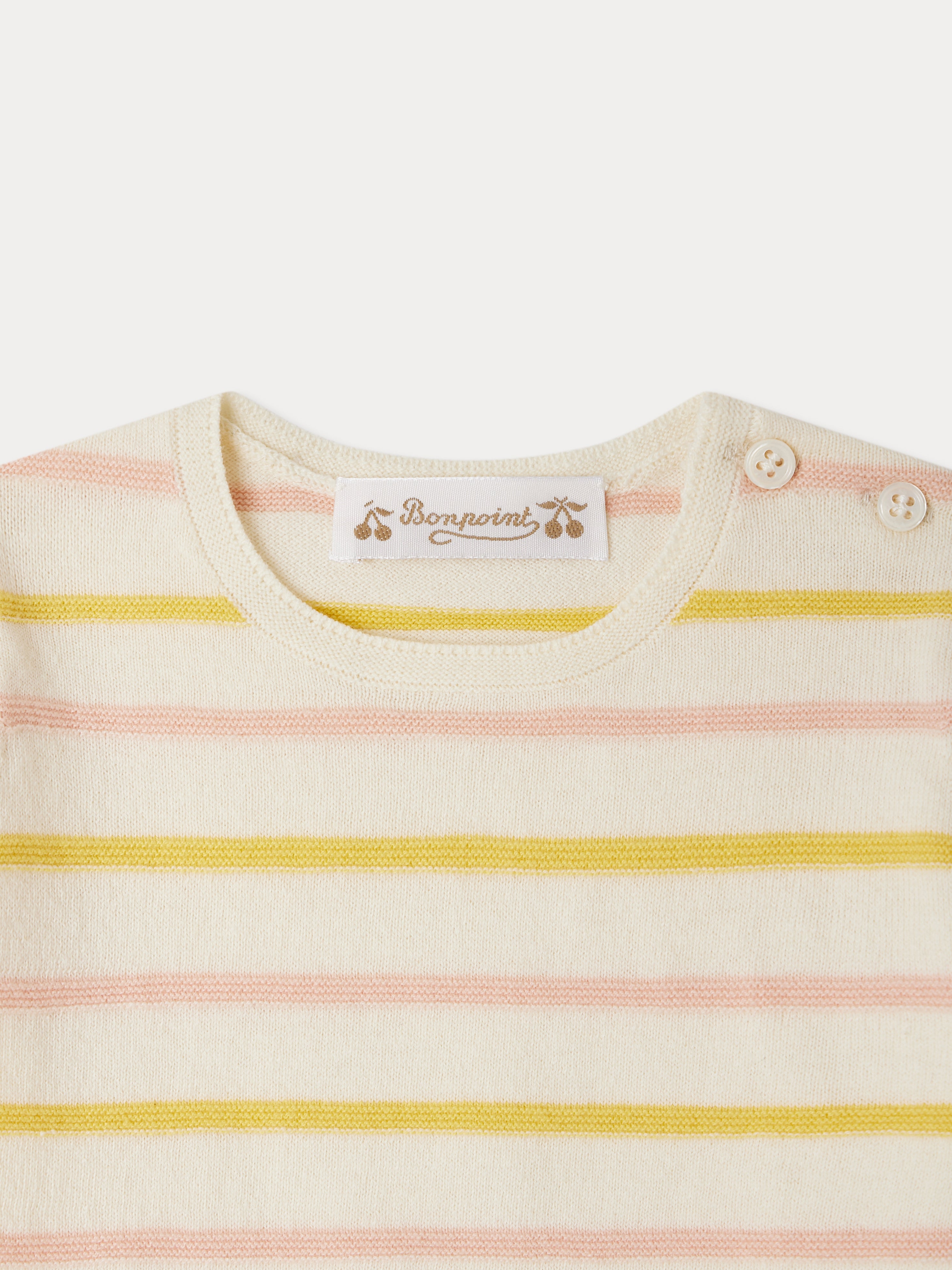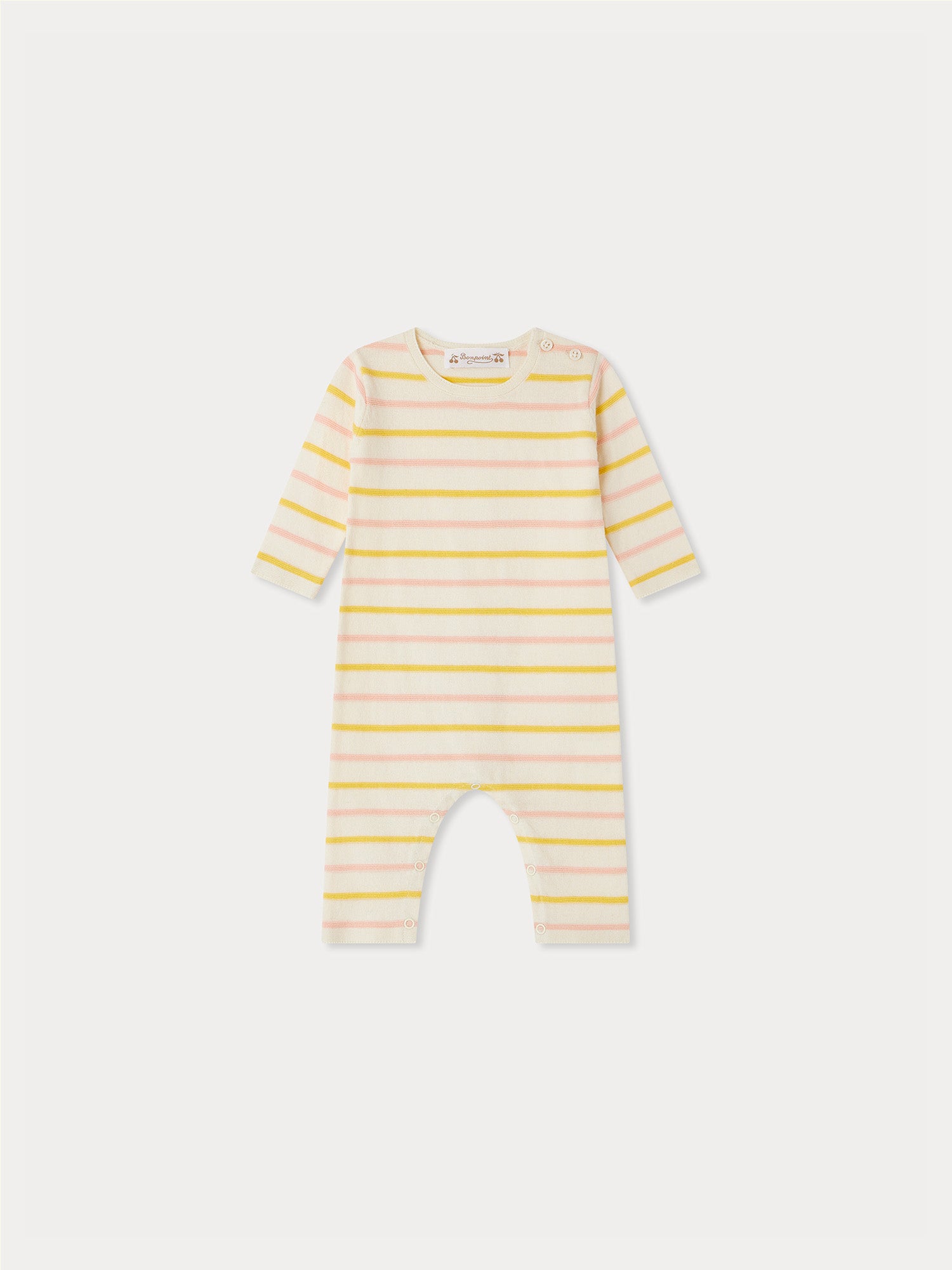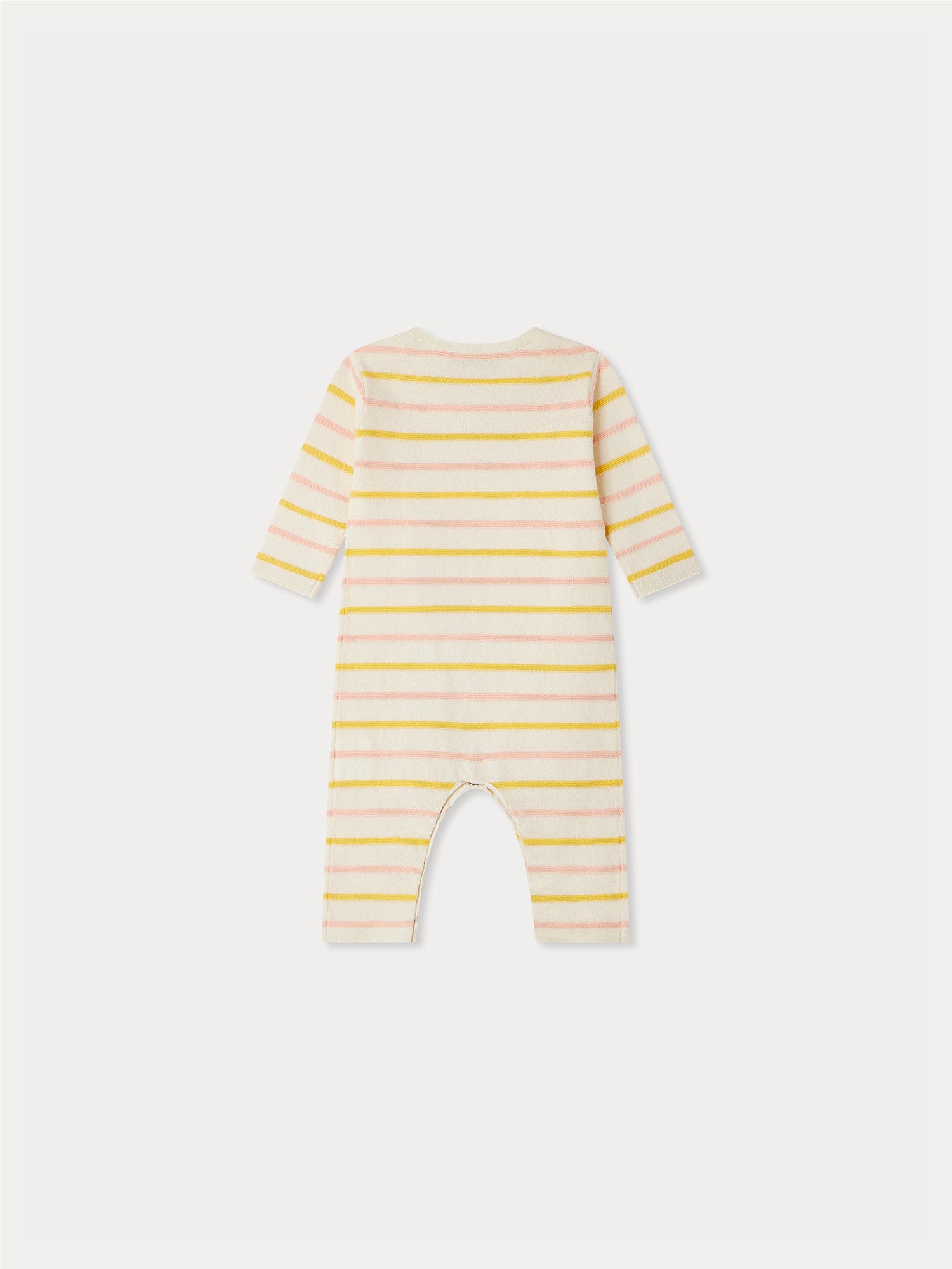ince triko ekru , sarı ,pembe çizgili ağ kısmından çıtçıtlı tulum %100 pamuk