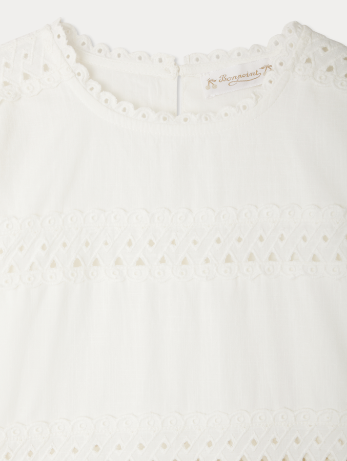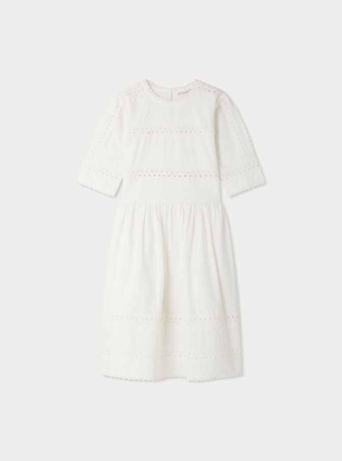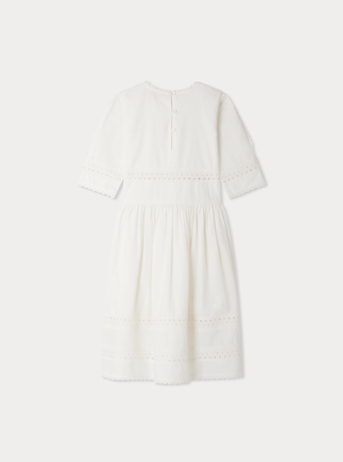 Bohem şıklığını Bonpoint kalitesiyle yaşatan bu beyaz elbise, fistolu detayları ve ince işçilikle zenginleştirilmiş tasarımıyla %100 organik pamuk kullanılarak üretilmiştir. Miniklerin hassas cildine uyum sağlar ve rahat bir kullanım sunar.
