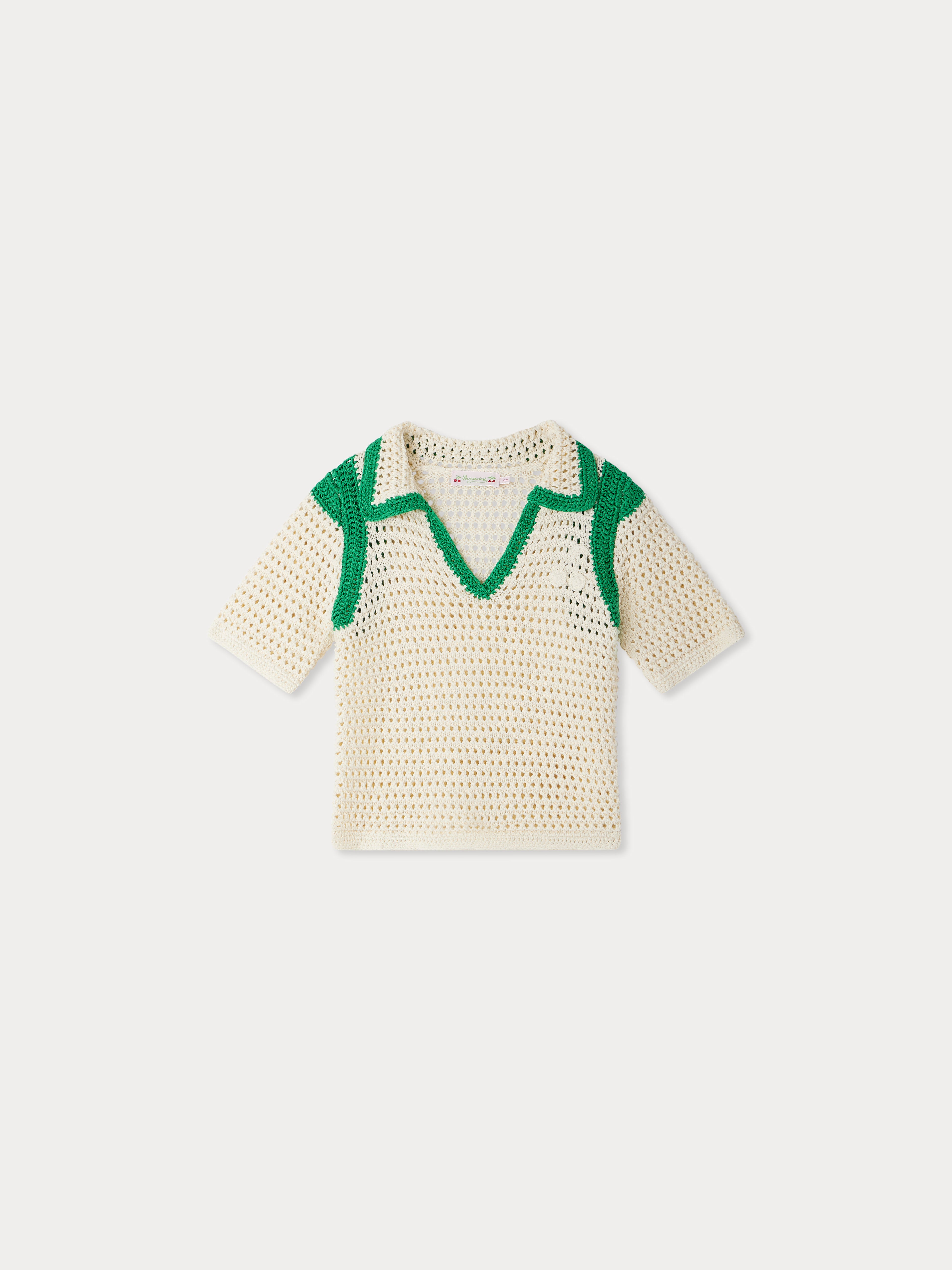 Bonpoint triko ajurlu dokusu ve kroşe yakasıyla dikkat çekiyor.