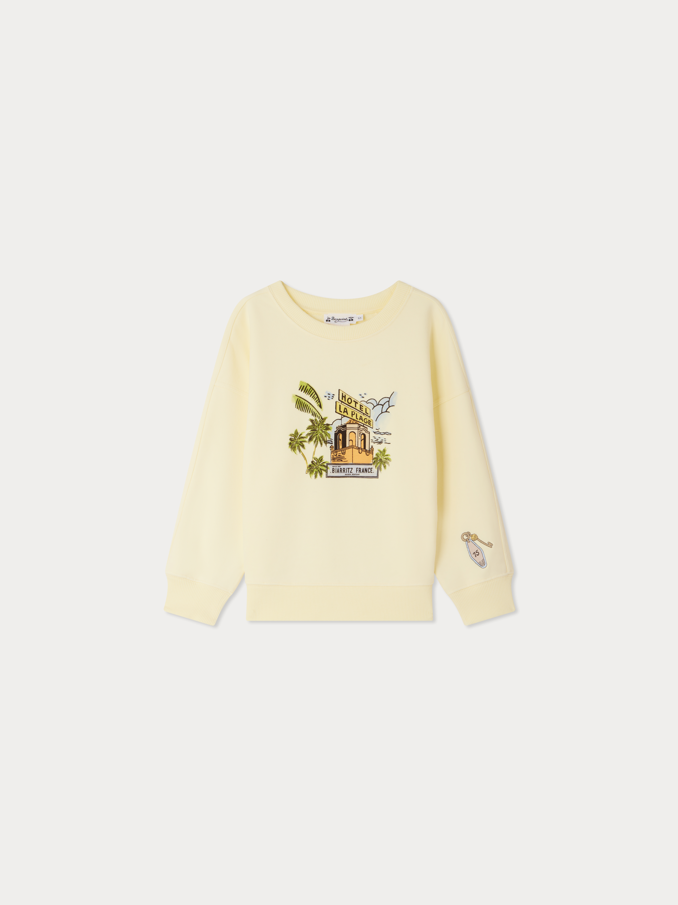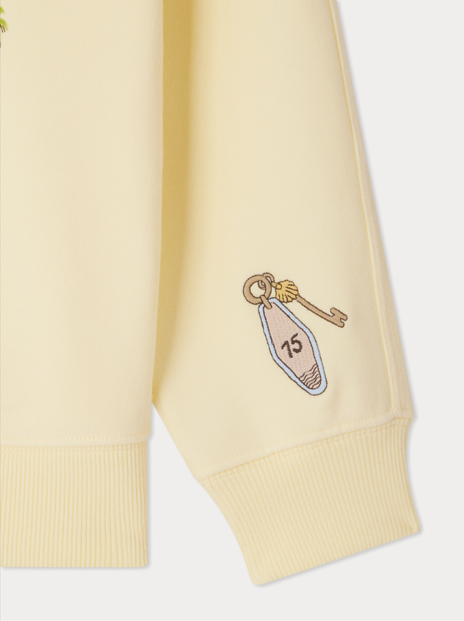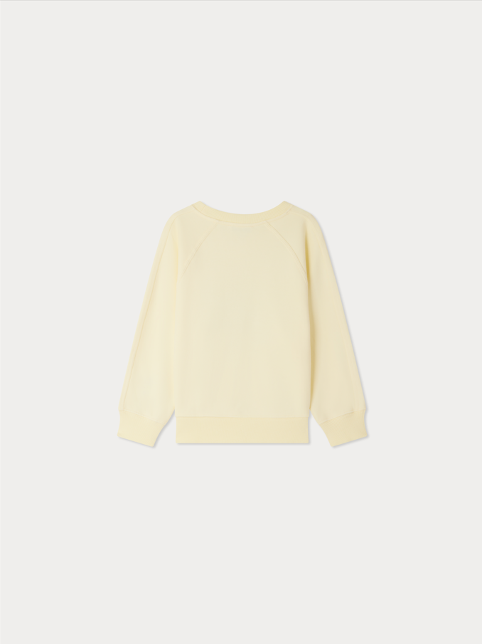 Bonpoint’in özgün detaylarla buluşturduğu bu sarı erkek çocuk sweatshirt, yaz sezonuna renkli ve enerjik bir dokunuş katıyor. Bisiklet yaka kesimi ile klasik ve rahat bir yapı sunarken, ön yüzündeki baskı ve sol kol altındaki anahtar aplikesi tasarıma özgünlük katıyor.