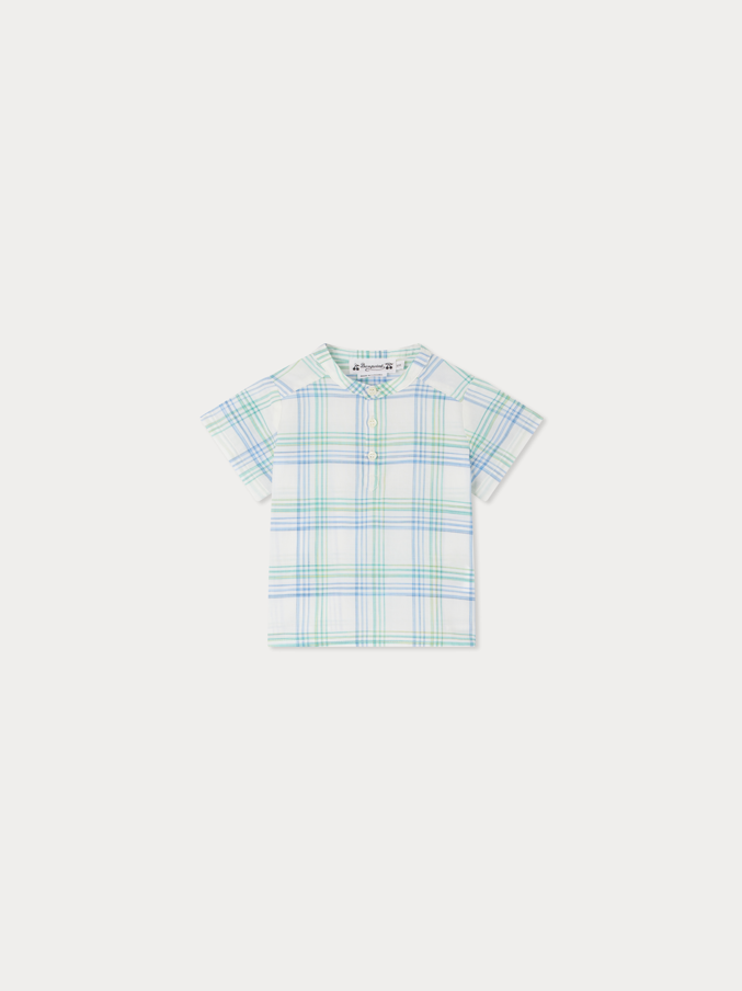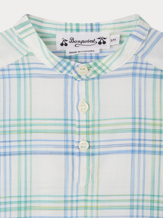 Bonpoint’in yaz 2025 koleksiyonuna özel bu beyaz, yeşil ve mavi kareli erkek bebek gömleği, ferah yapısı ve şık detaylarıyla yaz ayları için ideal. Hafif vual kumaştan üretilen bu model, kısa kollu kesimi ve hakim yaka tasarımıyla hem konforlu hem stil sahibi bir görünüm sunar.