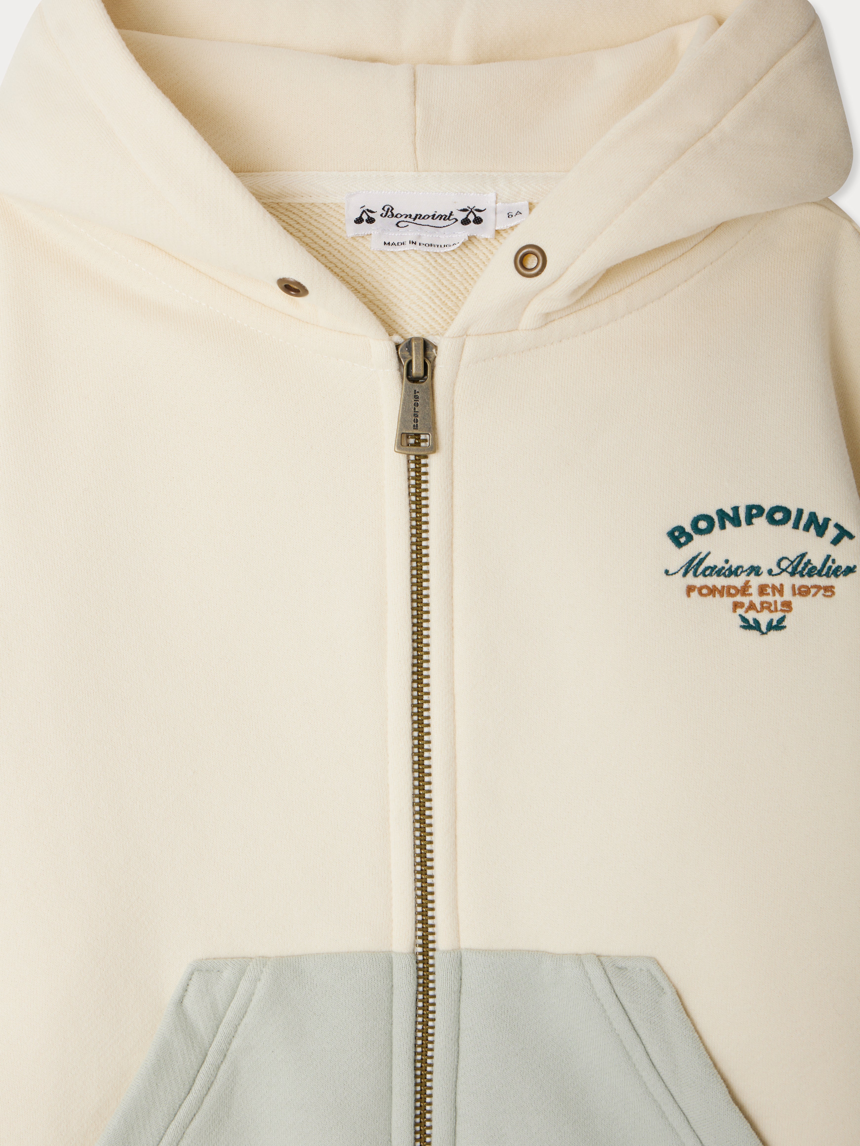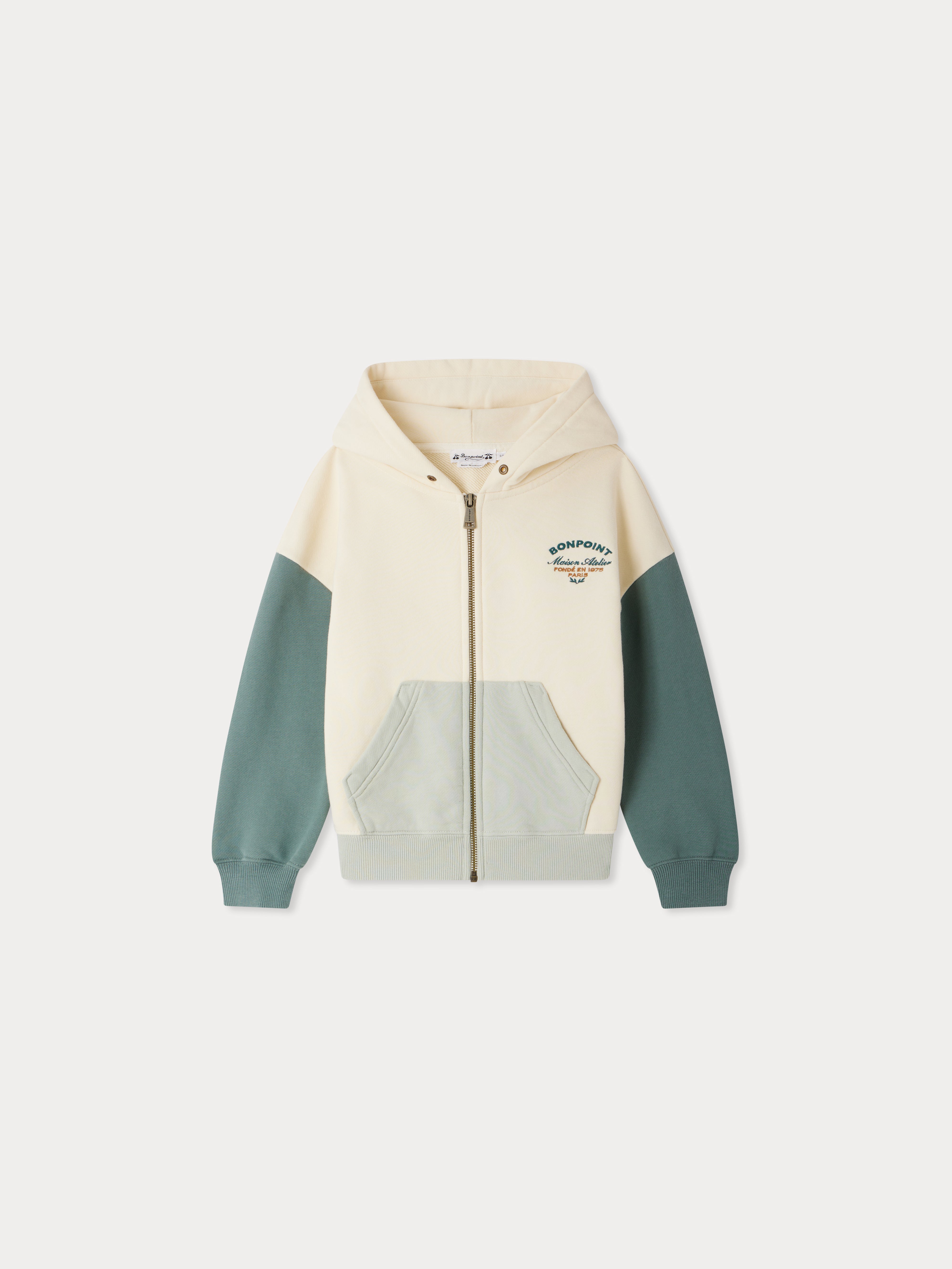 Bonpoint’ten hem nostaljik hem de modern bir dokunuş: Bu kapüşonlu erkek çocuk sweatshirt, ekru ve yeşil tonlarının dinamik geçişiyle retro bir tarz sunarken, konforlu yapısıyla da günlük kullanımda öne çıkar. Fermuarlı tasarımı, kanguru cepleri ve kapüşon detayıyla hem fonksiyonel hem şık bir tercih.