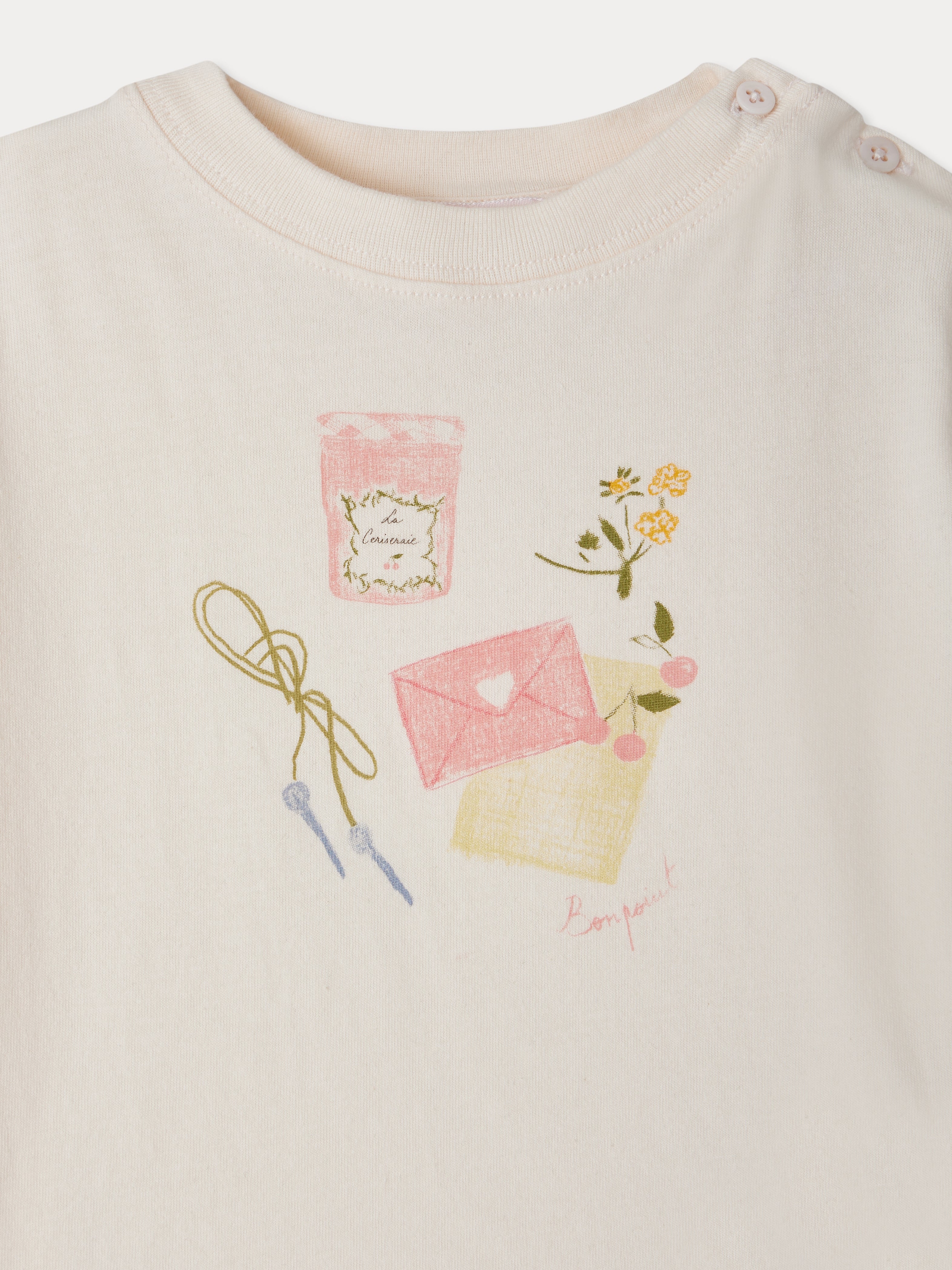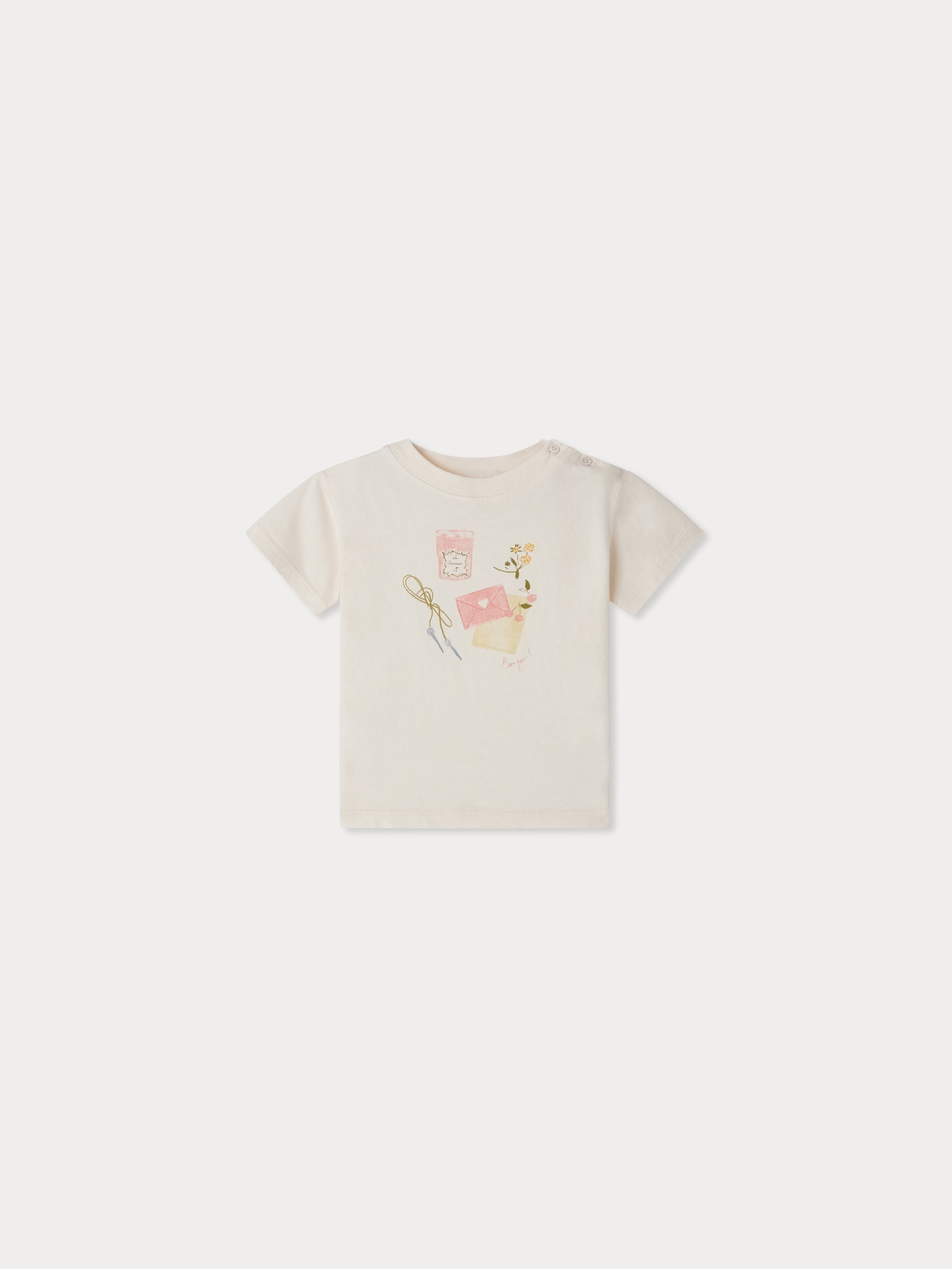 Bonpoint’in zarif detaylarla bezenmiş bu açık pembe tişörtü, sevimli çiçek ve reçel kavanozu baskısıyla yaz aylarına neşe katıyor. %100 organik pamuktan üretilen yumuşak kumaşı sayesinde kız bebeklerin narin cildine dost bir yapı sunar. Omuz kısmındaki düğme detayı hem şık hem de giyimi kolaylaştıran pratik bir detay olarak öne çıkar.