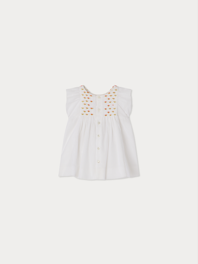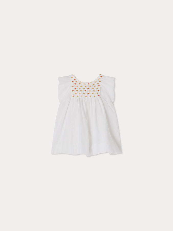 Bonpoint’in zamansız zarafetini yansıtan bu beyaz kız bebek elbisesi, bal peteği desenli işleme detayı ve ince tül yapısıyla özel günler için tasarlandı. Gövde kısmındaki bal peteği işlemeler, elbiseye el işçiliği hissi katarken; hafif tül kumaş, bebeğinize hem konfor hem de zarafet sunar.