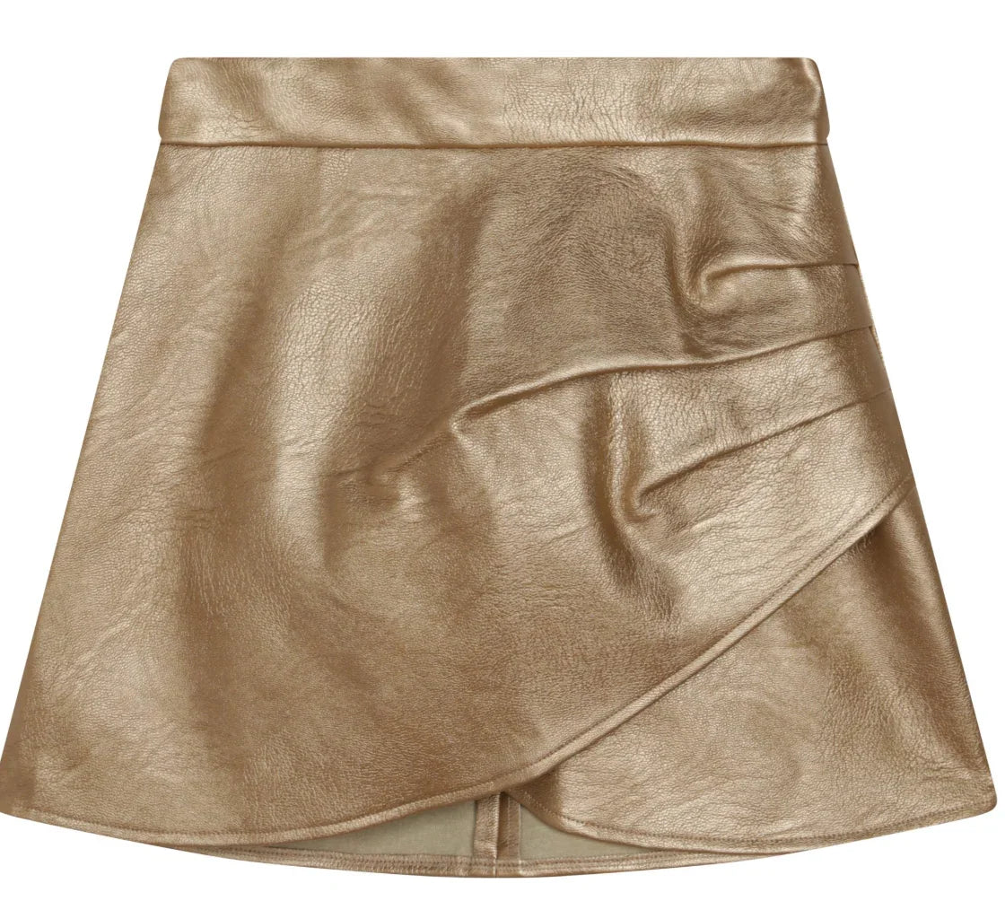 Kırışık görünümlü, arkadan fermuarlı önü drapeli gold deri kız çocuk etek, %100 viskoz