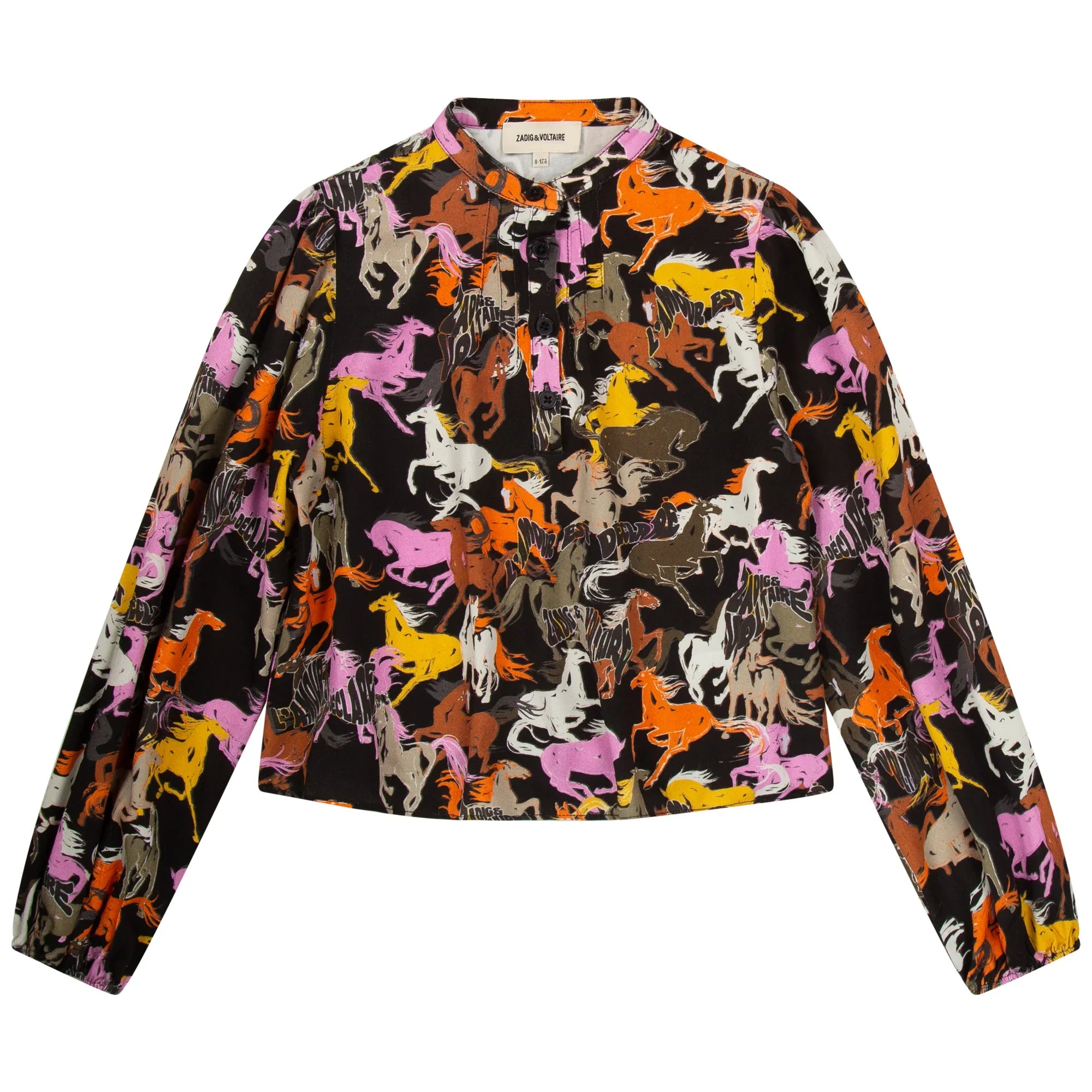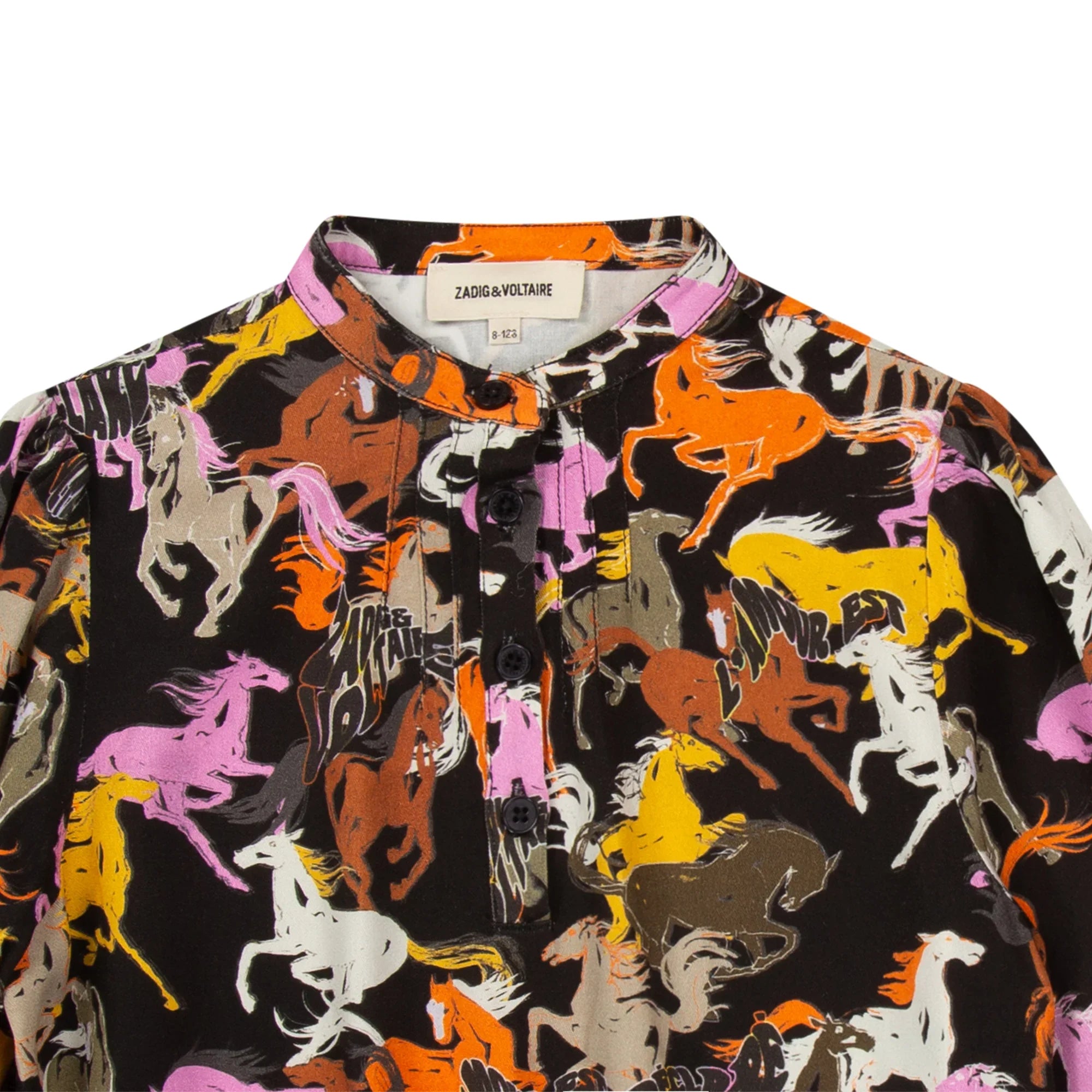 Önden yarım düğmeli , yakasız , siyah üzerine renkli at baskılı kız çocuk bluz, %100 viskoz