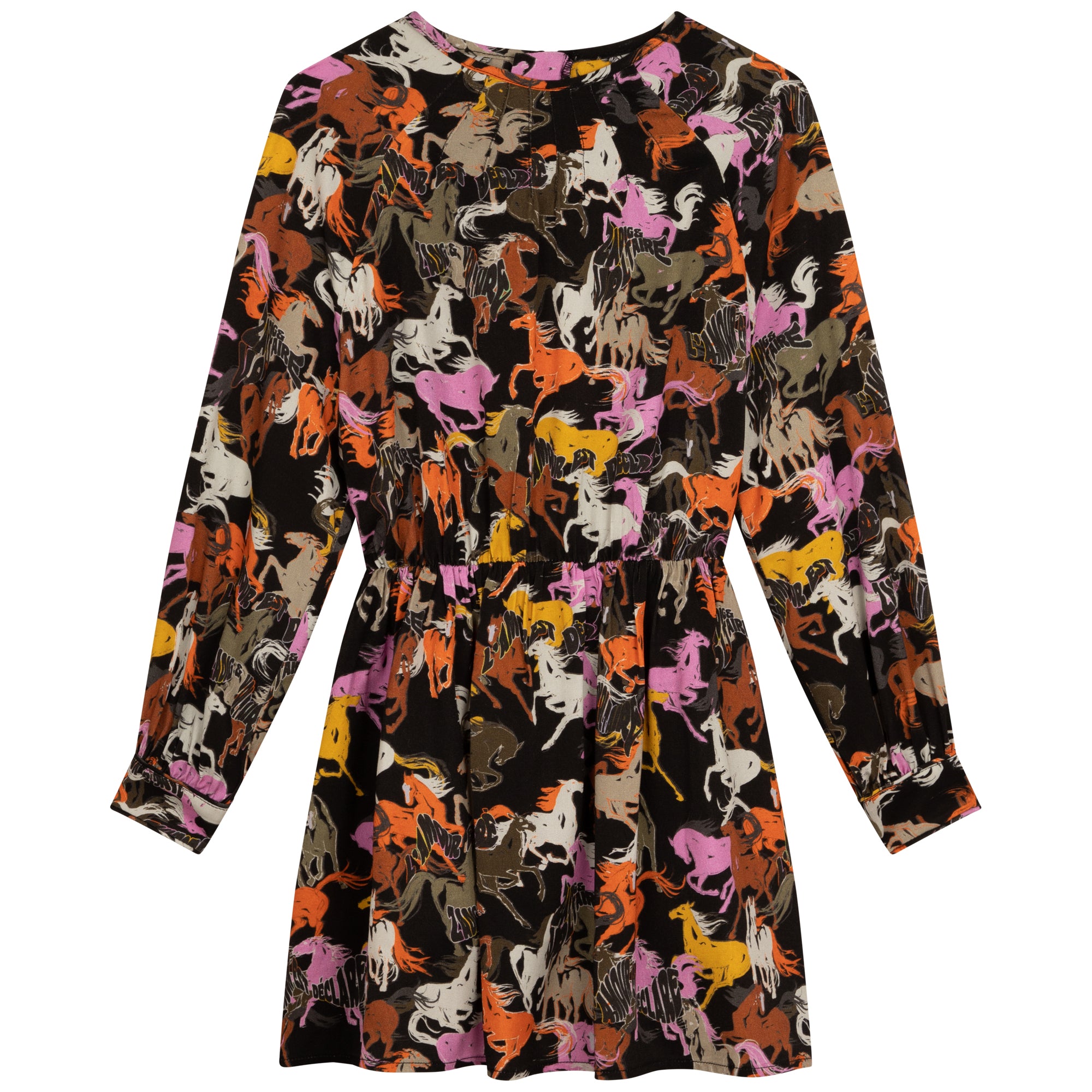 Arkası fermuarlı , beli lastikli , at baskılı kız çocuk elbise