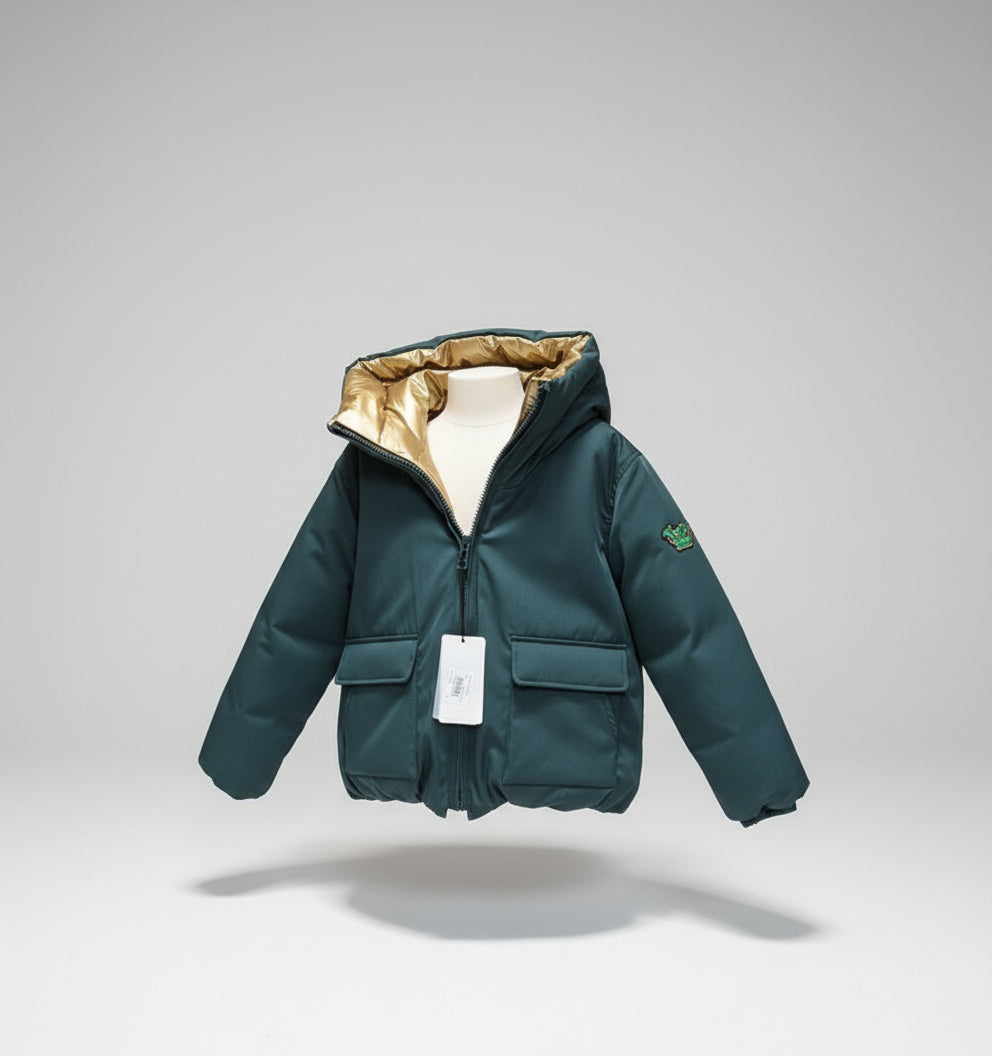 Koyu yeşil ve gold renkli ,çift taraflı giyilebilen , kolu Z&V logolu kız çocuk parka