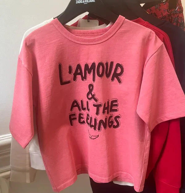 %100 pamuk pembe amour baskılı kız çocuk t-shirt